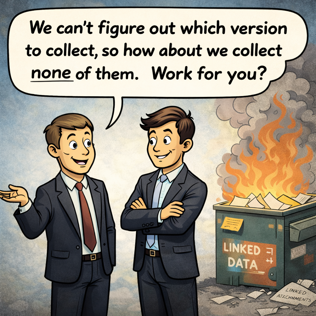To my eye, the versioning concern has been weaponized. It goes like this: a requesting party asks for linked attachments. The producing party raises the specter of versioning—“Which version do you want? The as-sent version? The as-accessed version? The current version? We can’t be sure which is the ‘right’ one, so the whole exercise is fraught with uncertainty.” And that uncertainty becomes the justification for producing no version. Not the wrong version. No version.