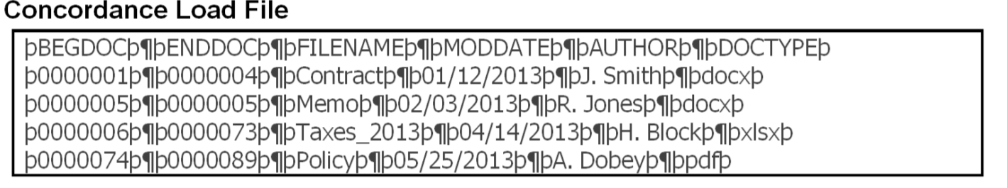 I refer, of course to the two symbols that serve as familiar field delimiters in Concordance load files; those persnickety text files that carry metadata and other information into e-discovery review tools. In order for tabular data to be discretely searchable, it has to be set off (“fielded”) from other data by a separator. On paper, we do this with vertical and horizontal lines, drawing rows and columns. We literally delineate the fields of data so first names don’t wander into, say, last names or street names. To accomplish the same end with digital data in load files, we use delimiters, such as commas, tabs or, in the case of Concordance load files, thorns and pilcrows.